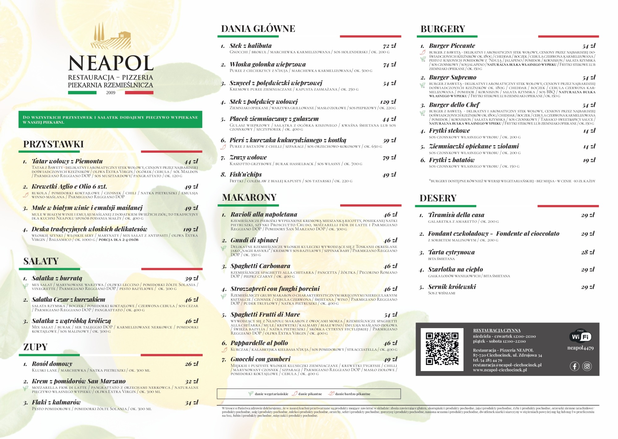 zapraszamy do zapoznania się z naszą aktualną kartą główną dań i napojów. Menu Restauracji-Pizzerii NEAPOL to połączenie klasycznej kuchnni włoskiej z autorskimi propozycjami inspirowanymi różnymi regionami Włoch.
